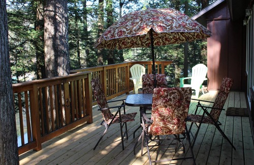 The cottage has two bedrooms and one bathroom. There is a queen size bed in one room and a double bed in the second bedroom. Enjoy a meal on the deck overlooking the lake. At night use the fire pit for roasting marshmallows or cooking hot dogs. The cottage is furnished with linens, blankets, dishes, coffee pot, toaster and cookware. There is a stove, refrigerator and it is air conditioned. Bring your camera as you may enjoy deer, raccoon's, squirrels and birds.