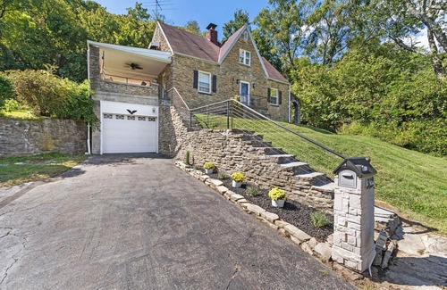 1940s stone cottage overlooking the Ohio River in historic Aurora, IN. Newly remodeled 3BR/2.5BA home with cozy décor, indoor/outdoor fireplaces, gazebo, yard games, and stunning river views. Sleeps 8–10 with full kitchen, sports bar, kids room, workspace & fast Wi-Fi. Walk to downtown, bike the nearby trail (2 bikes included), or hit Perfect North Slopes (18 mins). Close to casinos, Creation Museum, Cincy & more. A perfect getaway with storybook charm!