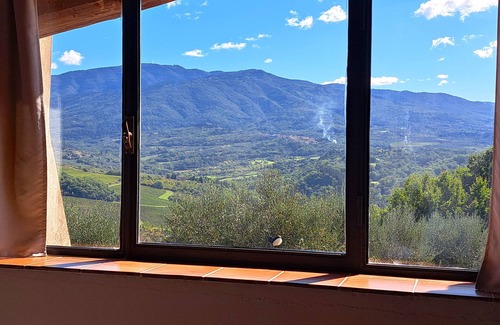 The room is full of light with 2 large windows looking over the valley. There are terracotta floors and beamed ceilings.