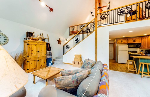 The whole family is welcome at this lovely home in a woodsy neighborhood. You may feel surrounded by trees when you look out from the deck, and lighting up the firepit at night may produce true camping vibes. But your group (and the family dog) will love settling in for some fun the family's game room. An electronic dart board, Ping-Pong Table, and air hockey table are all installed to provide the most fun for your family. When folks start getting hungry, cook something up in the full kitchen or fire up the private gas grill. The loft bedroom is perfect for folks that want a true bunk-style experience. This home is ready to be your home away from home - just a little closer to the lake!