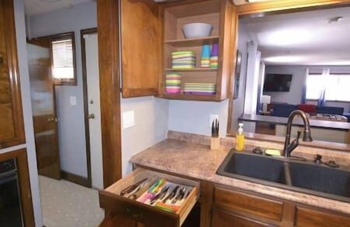 The Kitchen is fully functional with a blender, drip & k-cup coffee maker, pans, skillets, baking sheets, and cooking utensils. There are also dishes, glasses, mugs, and silverware available to use during your stay.