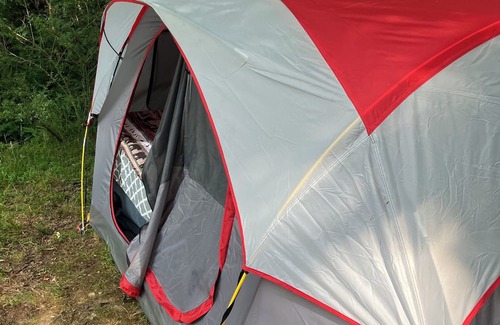 Located next to creek with minor electric for charging phones etc, camping tent with toilet. Outside shower available. As well as outside refrigerator. Propane grill currently out of service but you can use my personal grill located at my camper