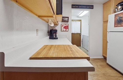 Step into a bright and inviting kitchen where functionality meets rustic charm. Honey-toned wood cabinetry provides ample storage, while spacious countertops offer plenty of room for meal prep. Modern appliances, including a stainless steel stove, microwave, and full-size refrigerator, ensure cooking is both efficient and enjoyable. A cozy breakfast nook and warm decor elements, like rustic wall art and colorful rugs, add personality to the space. Just beyond the kitchen, the dining area features a beautiful wooden table with matching chairs, set against classic wood-paneled walls. With its seamless connection to the living space, this dining area is perfect for gathering with family and friends to enjoy meals and create lasting memories.