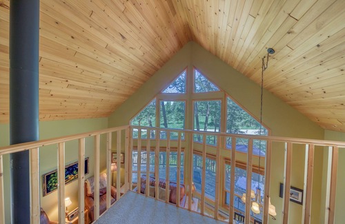 Main Level - Great Room: Wood stove, comfy seating, vaulted ceiling to forest view, Smart TV to stream movies & shows, Netflix and more