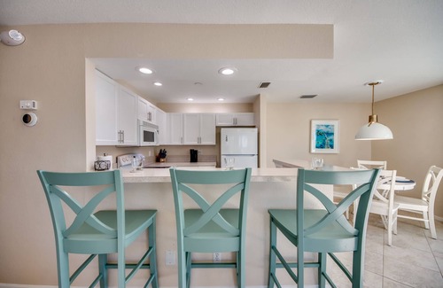 Spacious 2 bedrooms each with king beds plus 1 queen-size pull-out couch in the living room. 2 bathrooms, one with shower/tub combo, one with stand-up shower. Fully stocked kitchen, individual patio. Shared washers and dryers available onsite, sleeps 6. Linens are included! We provide all bed linen, bath towels, hand towels and even a set of towels you can take to the beach. This unit is on the upper level, right side.