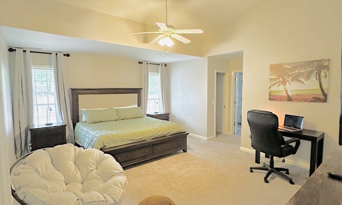 Our master suite is designed to provide you with a spacious and comfortable retreat. It features a king-size bed, two nightstands with touch lamps, a 55-inch smart TV, a ceiling fan, his and her walk-in closets, and a desk for your convenience. Additionally, you will have exclusive access to a private en suite bathroom, which includes a double sink, closet, deep soaker bathtub, and walk-in shower.