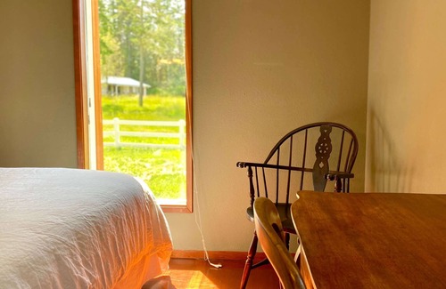 The second-floor Queen bedroom with shared bathroom looks out over farm and forest. Catch golden sunlight through the south-facing window from your cozy bed with organic Coyuchi linens and a Fir Oak Farm wool duvet insert. It shares a generous bathroom with the Double Full bedroom next door, appointed with organic Baina bath linens and bathrobes from Block Shop Textiles. If your family or friends book both rooms as a suite, you'll have your own exterior entrance and private living room.