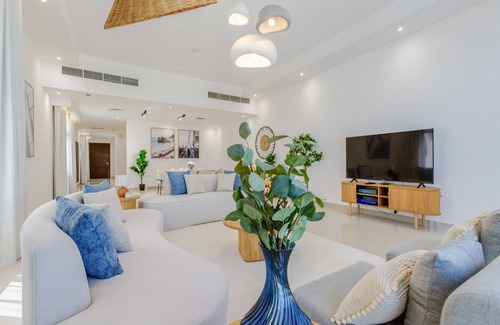 Nestled in the beautiful scenery of Al Dana Island, the luxurious Sharm - Al Dana Villa offers breathtaking pool and sea views, ideal for an exquisite holiday retreat. The villa houses five spacious bedrooms, including one with a king-sized bed, three with queen-sized beds, and another with a single bed, ensuring plenty of space for family or friends. The living area is adorned with a comfy sofa set and a smart TV for entertainment, perfectly blending relaxation with style.