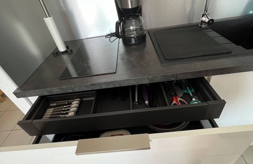equipment: fridge-freezer, extractor hood, 2-burner ceramic hob, microwave, kettle, toaster, coffee maker, complete crockery, washing machine, vacuum cleaner, "Rapido" sofa bed + 1 bench seat with 2 beds , TV and reversible air conditioning.