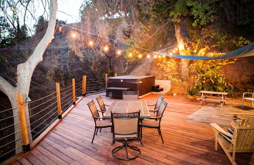 Our home in the hills above Pomona boasts incredible sunrise views & hundreds of square feet of outdoor decks and patios surrounding the house. Minutes from Fairplex at Pomona, parks, golf courses & the Claremont Colleges, it's nestled above it all in a quiet canyon. The house has a large living and family room complete with leather couches, large fireplaces and televisions, and two spacious bedrooms—one Cal King bed and two twin beds. Decks and patios surround the house on three sides, as do the countless trees lining the hillside. The house features a fully stocked kitchen, laundry, 8-person spa and all the comforts of home. A dining room, breakfast nook and several outdoor decks provide plenty of table seating both indoors and out, affording you a perfectly relaxing getaway.