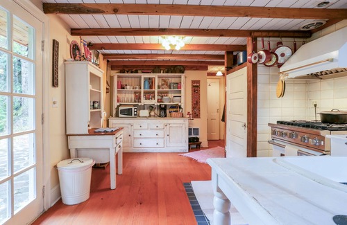 Ideal for a romantic getaway for two or a fun-filled vacation, this secluded Scandinavian gem sits in a verdant valley just a few miles from Rhododendron and features a full kitchen equipped with a Viking professional gas range, a wood-burning fireplace, a furnished stone patio with a gas grill, and easy access to a babbling brook. There is also an outdoor firepit and a sound dock for music.