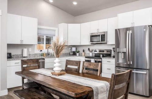Sego Lily Loft Hideaway offers a bright and airy living area with modern furnishings, a fully equipped kitchen, and a dining area. Enjoy seamless connectivity with high-speed fiber optic internet and smart TVs in the living room and lower bedrooms. The home features two bedrooms, plus a loft with a queen bed accessible by ladder for those seeking a unique sleeping space. The home has two well-appointed bathrooms, one is an ensuite in the primary bedroom and the other is shared for the guest room and loft. Designed to sleep up to six with a cot for a seventh guest, Sego Lily Loft Hideaway also conveniently boasts a private fenced patio with a BBQ and seating area. Parking is available to all on your own private driveway. You will marvel at the vibrant hues of Kanab's iconic red rocks staying here.