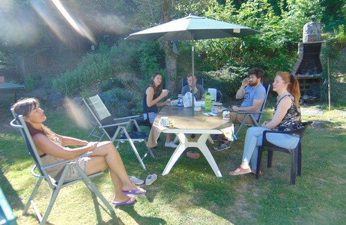 Private enclosed garden of 100m² with garden furniture, deckchairs, charcoal barbecue, children's games, and ping-pong table.