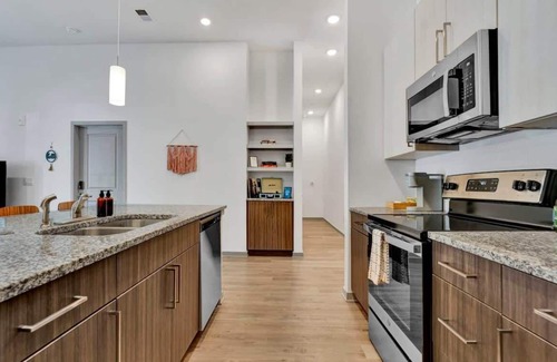 Step into style and comfort with thoughtfully designed spaces featuring luxurious wood-style flooring, stainless-steel appliances, and stunning tile backsplashes complemented by sleek granite countertops. Each home boasts high-powered Wi-Fi, a deluxe 65” flat-screen TV, and contemporary furnishings. Soaring nine-foot ceilings, designer lighting, and ceiling fans create an airy and inviting atmosphere.