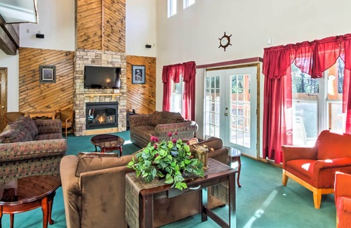 Inside, the home is appointed with comfort in mind and offers plenty of room to spread out or gather together with the group. The living room features 3 plush sofas and soaring vaulted ceilings, inviting you to take a seat and stay awhile. Start a movie on the flat-screen cable TV for a movie night complete with a gas fireplace to keep you warm!