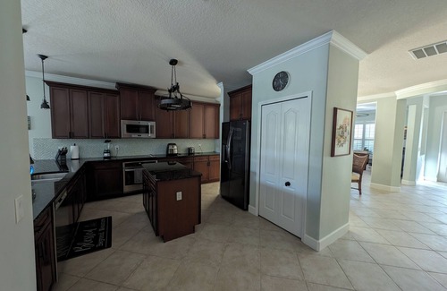 Welcome to your peaceful retreat where you can rest, recharge, and play. The home’s theme is sea-shells; after living in the Denver area for 30+ years and moving here the decision was ocean & shells. Both in-side decorations and out-side landscaping are based on ocean, shells, and tropical. With this comes relaxation during your peaceful days and nights. We do live here so it is well maintained and much nicer than a regular rental. You will have access to the entire 2,100-sf house including the swimming pool. The garage is locked for our personal storage. The subdivision’s clubhouse is available and it has a large pool (not heated), modest workout room, billiards table, ping-pong, foosball, and playground.