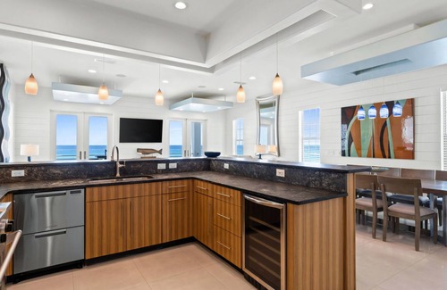 Inside, the open-concept living and dining area features floor-to-ceiling windows and shiplap accents, while the chef’s kitchen is equipped with stainless steel appliances and a gas range. One of the private bedrooms includes a wet bar with a mini-fridge and sink, and multiple Gulf-front suites—including an oversized master with a spa-like ensuite—offer comfort and privacy. A custom bunk room provides a fun, dedicated space for kids or larger groups.