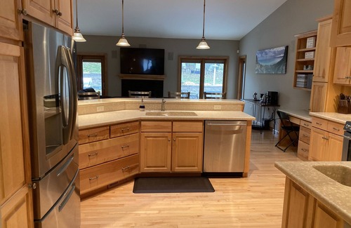 The kitchen has room to cook for the entire party with a Jenn Air gas range, three sinks in the kitchen and wet bar area, large stainless steel refrigerator and enough pantry room to store all your food and beverage. Extra range, refrigerator, sink and dishwasher in the basement to make clean up and storage a non issue. Wet bar in upper level also has an under cabinet dishwasher and mini fridge. The owners love to entertain and the house is stocked with all the needed appliances and gadgets such as a Kitchen Aid stand mixer, powerful blender, heavy cook ware, coffee bar with burr grinder, hot water kettle and pour over, French press and standard coffee maker included with rental.