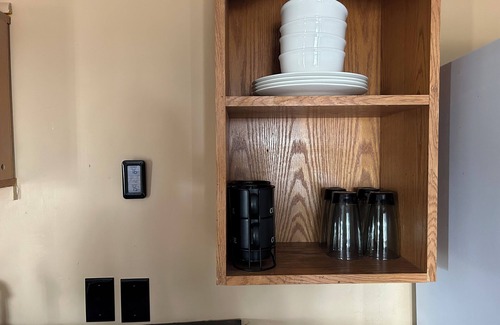 The space includes a full bathroom and a half bathroom, a fully equipped kitchen. The living area has a TV with an Amazon Fire Stick (note: no Wi-Fi—guests must connect using their own hotspot). Please note: electrical outlets are located on the floor and only on one side of the house, so plan your device setup accordingly.
