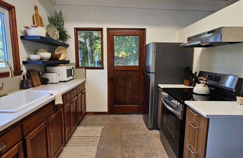 Wake up each morning to the serene sounds of the Skagit River flowing just outside your window and soak in the panoramic vistas of the rugged mountain landscape. The Riverhouse is a 1 bedroom, 1 bathroom house that boasts mid-century modern architecture and is designed to offer comfort, charm, and functionality. It features all the amenities a guest would want including a fully equipped kitchen (sans dishwasher), a well stocked coffee/tea bar, ample toiletries & grooming essentials, plush cotton bedding, towels, and throw blankets, perfect for snuggling on the comfy sleeper sofa infront of the gas fireplace. The livingroom also features a large TV connected to wifi, a desk with various charging ports, a variety of games & puzzles, and the best reading nook with views of the river!