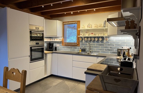 Middle floor: Open plan lounge with comfortable seating for 12 set around a contemporary wood burning stove. Kitchen (new induction hob and oven) and dining area, WC, entrance hall with ski boot warmer, doors lead onto the outside balcony which has stunning views of the valley.