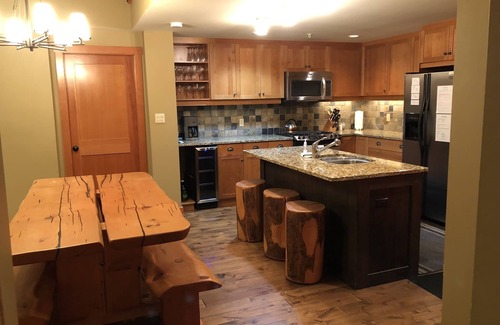 Welcome to our vacation rental! Ski-in/ski-out, slope-facing, luxury penthouse condo at the base of Red Mountain. Beautifully furnished, fully equipped condo sleeps 8 in comfort. 2 queen bedrooms and loft room with 4 single bunk beds. Master bedroom has spacious en suite bathroom with luxury steam shower and twin vanity unit and a second bathroom with bath, shower and vanity is situated next to bedroom 2 and at the foot of the stairs leading to loft bedroom. Open plan well equipped kitchen, double height dining and living room with picture window overlooking the mountain. Separate TV room/den. Kitchen is fully fitted with wine cooler, stainless steel appliances and granite counters. Top quality mattresses, leather couches and solid wood furniture make this a truly comfortable vacation rental. Relax on the mountain-facing deck in the hot tub or enjoy the steam shower in the master en-suite bathroom. Washing machine and tumble dryer included in unit. Basic food staples, and bathroom supplies included. Local on call concierge. Private heated underground parking. Free wi-fi is included.