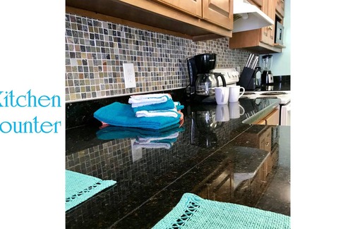 Once you enter our unit the hall opens up to the FULLY EQUIPPED KITCHEN that features GRANITE counter tops, and a BREAKFAST BAR that seats four. There is a stacked WASHER/DRYER in the unit. The kitchen overlooks the dining table and living room. The living room has a SLEEPER SOFA to sleep 2 guests and a FLAT SCREEN TV. Glass BALCONY doors in the living room open up to the large balcony that overlooks the COURTYARD POOL, glimpses of the beautiful BEACH view, and sight lines of the TENNIS COURT.