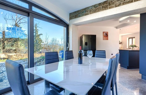 Beautiful, luxurious villa "Solaria", 2 storeys in 2024. In the hamlet Krti 8 km from the centre of Motovun, 15 km from the centre of Buzet, in a quiet position, 30 km from the sea. Private: property 450 m2 (fenced), swimming pool angular (3 x 6 m, depth 140 cm, seasonal availability: 15.Apr. - 01.Nov.) with internal staircase. Outdoor shower, terrace, garden furniture, barbecue. In the house: internet access, washing machine, tumble dryer. Parking (for 2 cars) at the house on the premises. Shop 7 km, supermarket 10 km, restaurant 7 km, bus stop 15 km, 5 km. Walking paths from the house 50 m. Nearby attractions: Winery 8 km. Please note: airfield 45 km from the property.