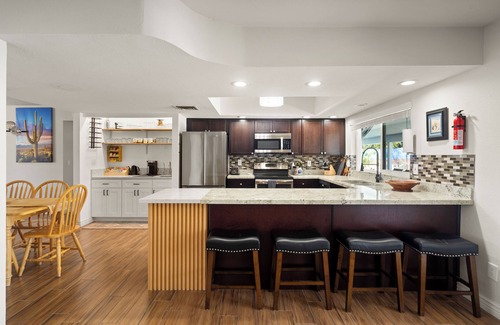 The 3-bedroom, 2-bath house features a private free heated pool & spa with no additional cost, a backyard patio, and newly renovated living spaces. Located within walking distance to the South Mountain Park where you can hike & mountain bike. Situated in a quiet neighborhood, in a central location, close to Spring Training and local Phoenix sporting and entertainment events.