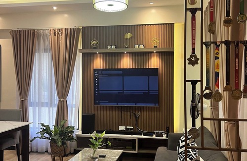 This Parañaque condo boasts 2 inviting bedrooms, featuring 1 bunk bed and 1 queen bed. The bathroom is equipped with a shower and bidet for your convenience. Enjoy the delightful and charming atmosphere of this phenomenal space, complete with amenities like an iron, WiFi, and AC. You're sure to make fantastic memories with a stay at our place. The space is fully furnished Hotel themed interior design. Every space in the area is designed and adorned with elegant and modern accessories as the owner is a design enthusiasts.