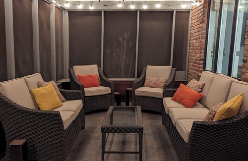 Stay comfortably in Lawrence at this 4-bedroom house. Each bedroom offers a different sleeping arrangement, from a king bed to a bunk bed. The house features heating, WiFi, AC, and a washing machine/dryer for your convenience. With 3 bathrooms equipped with showers as well as a powder room on the main floor, you'll have plenty of space to freshen up. An additional living room in the basement, with a built-in twin bed, provides extra space for guests. A screened in back patio let's you unwind outdoors.