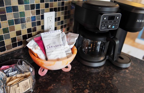 Prepare a quick snack or a large feast in the fully-stocked kitchen. It features beautiful countertops and modern appliances, including a refrigerator, stove, oven, microwave, and toaster. Visit the coffee station with a large drip coffee maker as well as a nice brew.