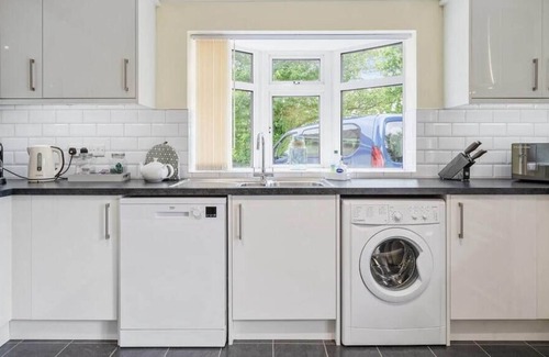 The spacious living room is the perfect spot to relax on cooler evenings: slump back on one of the relaxing sofas and find something to watch on the Smart TV with Apps. You will also find a handful of books, which you are welcome to borrow, as well as a set of French doors that leads out into the leafy garden. The bungalow has 4 bedrooms in total: 1 king room, 1 double and 2 twin rooms. All have been furnished with high quality linens and storage space to hang your clothes. These share 2 bathrooms: a family suite with a separate bath and luxurious waterfall shower, as well as an ensuite with a further shower. Summer's days are best spent out in the garden, with its spacious lawn and pretty borders. Enjoy your morning cup of tea in the sunshine or a tipple or two at sunset! Parking for 2 cars on the driveway.