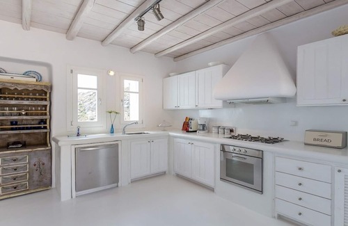Charissa is an elegant and spacious family Villa, south facing in a privileged wind-sheltered location above the marvellous golden sand Agrari Beach (10 mins walk) with magnificent views of the Aegean Sea. The villa has a charming interior schemed in light blue, white and ochre with a beach house style combining the traditional elements of Cycladic architecture with provincial selected details, it is air-conditioned and heated throughout sleeping 18 guests in 7 bedrooms and 6 bathrooms. The main villa sleeps 8 in one master en-suite, one double, a shared bathroom plus a third bedroom that has 2 bunk beds, perfect for 4 children and a further 10 people can be accommodated in the 4 guest suites, all with their own bathrooms and separate entrances providing the option of independence and privacy. The fully equipped kitchen with modern appliances leads to a large bright dining and living space directly accessing the swimming pool and its wide terraces. The outdoor spaces are surrounded by rocky hills and Mediterranean herbs embracing the true spirit of summer living with 300 m² of split level sea facing terraces, seating options and a dedicated area for entertaining with a stone sculptured dining table and barbecue sheltered by a large pergola. An elegant lagoon shaped infinity pool with Jacuzzi section dominates the upper terrace, perfectly positioned with far reaching views to the mesmerising blue sparkle of the Agean sea.