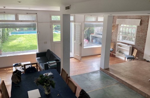 The house is 300 m2. It has 3 bedrooms (one in suite), 4 complete bathrooms , fully-equipped kitchen, dining room, living room, garden, swimming pool (8x4metres) , large Jacuzzi, barbecue, free WIFI, two flat screen TV's with cable TV, parking. Provides towels and bed clothing. Very nice area with many restaurants and many nautical clubs. It is one block from the river Walking distance from historic San Isidro área and Cathedral.