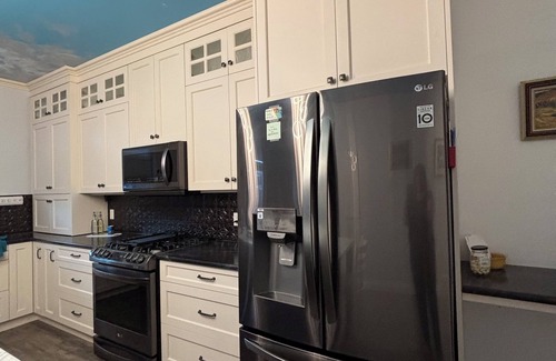 This 2-story 1800 sq ft laneway home is located in a delightful historic desert town. It is at the back of a modern building and accessible via a quiet rear lane. The house features spacious comfort and solitude away from the hustle and bustle of main street. Level gravel parking, easy level access. The home is open concept on the main floor featuring a living and dining area, a dream kitchen with large island, a powder room, and two outdoor patios, one is covered. Follow the wide staircase up and find two large bedrooms located at opposite ends of the upper floor, each with access to a large sundeck for evening enjoyments, such as stargazing, An open social room offers a desk and 3 sofabed chairs which conveniently unfold into various sleeping configurations such as 3 twin beds, or double size or triple size bed. The full bathroom is mindfully set up in two adjoining spaces: the main bathroom features double sinks, shower and bath. Next to it is the powder room with full laundry facilities. There is TV on each level and wireless internet and streaming entertainment.