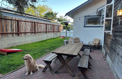 Unite with friends and family in this cozy renovated beach cottage near OB Dog Beach. This home brings warm cottage charm with lots of space to share whether its drinking coffee on the sunny front porch, playing on the grass in the side yard, or watching the sunsets on the rooftop deck. Only 5 miles from the airport so you will hear some airplanes but you will also be 4 blocks from OB Beach.