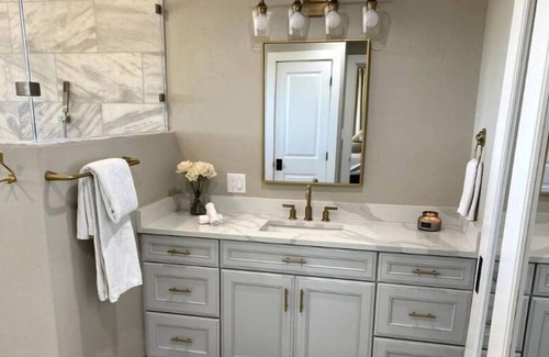This beautiful property features a spacious master suite with a king bed and direct access to the patio. It also has a large ensuite bathroom with multiple vanity and sink spaces and a large shower. The house also features a unique room equipped with bunk beds to help accommodate all guest types. The other two bedrooms of the house both feature king beds and beautiful views of the Texan Hill Country. These bedrooms are serviced by a bathroom with a double vanity and bathtub/shower.
