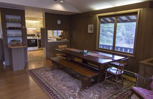 Loved family home located in the heart of the Southern Vermont ski area. This two floor chalet features a wrap around deck on the second floor that enters into a large open design space with cathedral ceilings. The whole family and more can share this large living area, with fireplace and television, while eating together on the large wood dining table. The upstairs also holds a master bedroom, kitchen, and one of the houses 2 bathrooms. Downstairs, which is also accessible from outside through a mud room, has another living area with a fireplace and television. There are 3 bedrooms and a bathroom downstairs along with laundry facilities. One bedroom has 4 bunk beds, another 2, and 1 room has 2 separate beds. Great for an extended family, 2 families sharing a vacation, or a large group of friends - the house can sleep 10. The house sits on a wonderful, quiet, 3+ acre lot with an outdoor patio, garden beds, and walking greens with a fire pit area.