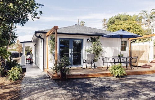 The primary bedroom features a California king bed and french doors that open to a lovely sunny space to soak up the California Sun! There are 2 additional bedrooms with Queen beds, an additional trundle including a reading nook for the kiddos with a twin chaise.