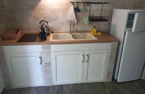 Studio with entrance in front of the garden, fresh and bright, there are a double bed and a sofa bed, suitable for couples but also indicated as a couple with 2 children. Kitchenette with kitchen equipment and also the bathroom with shower, equipped with washing machine. Provided bed linen, bathroom, kitchen.