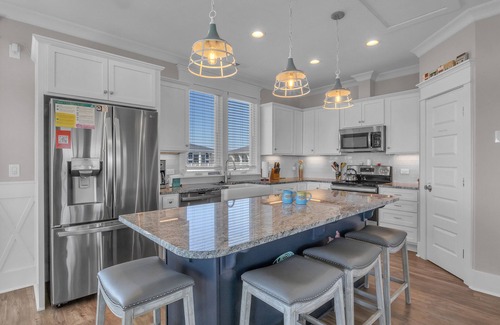 This four-bedroom, five-and-a-half-bathroom home features three flat screen TVs . The kids will love hanging out in their own “groovy" Surf Den. Rainy day, no problem! Stairway to Haven comes with plenty of inside and outside games to keep you busy.