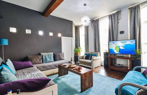 Both apartments are located on the same floor and can be booked together to accommodate up to 15 guests, perfect for groups or families traveling together. Once inside, you`ll be impressed by the Victorian Gothic architecture, with high ceilings, arched windows, and original beams and columns. The loft-style open plan living spaces are perfect for socialising and the fully equipped kitchen and dining area make self-catering a breeze.