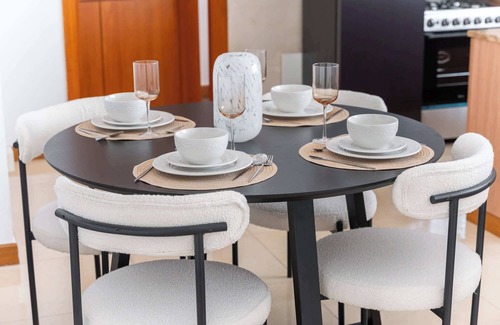 The open-plan dining and sitting area features satellite TV, perfect for relaxing after a day at Ski Dubai or shopping at Mall of the Emirates. The kitchen includes a washing machine for your convenience, and we provide hotel-grade bed linen and towels, along with initial toiletries like shampoo and soaps to ensure a seamless arrival.