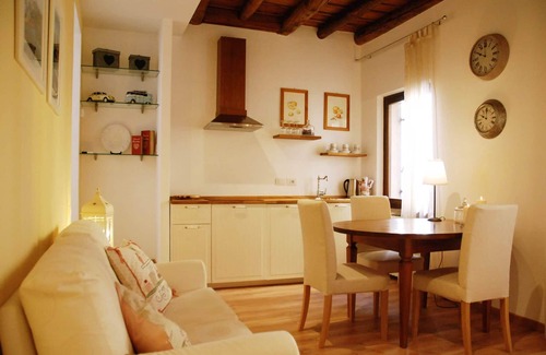 The exclusive apartment boasts ceilings with wooden beams, parquet and refined furnishings. It has two living areas, flat screen TV, free sheets and linen, and bathroom supplies.