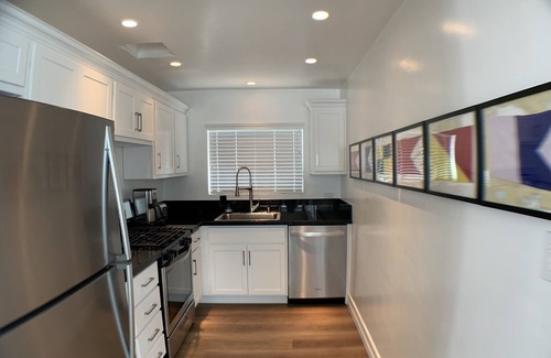 Balboa Escape is located mid peninsula and half a block to either the Beach or the Bay. It is a short walk to the Balboa Ferry, Catalina Flyer and many great restaurants. The closest bike rentals are only 2 blocks away. This apartment has just been updated with new fully equipped kitchen, cabinets, granite countertops, appliances, windows, AC and flooring. Beach Towels are provided. It is light and airy with lots of windows. This is a 2nd floor apartment and the largest in this 4 apartment building. It has a comfy queen size captains bed in the bedroom with storage underneath and a chest of drawers and a closet. The living room has a pull out queen sofa sleeper and there is a chest for storage and closet in the living room as well. New Smart TV with cable and free WiFi. There is one garage parking space for a subcompact car. There are Beach chairs and boogie boards in the garage. The coin op laundry is located in the garage. There is a shared patio with table and chairs and a Weber gas grill. This is a perfect location for a relaxing stay at the beach. No animals are allowed on property due to allergies. One flight of stairs must be climbed to Access this apartment. SLP13796