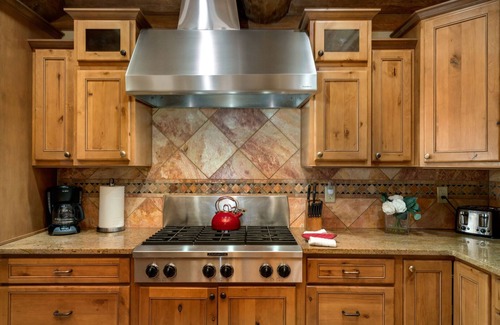 When it's time to dine, you can always go out but a home-cooked meal is also an option for those who book Stone Creek Lodge. The culinary space in this property is spacious and inviting. Here, visitors can enjoy access to stainless steel appliances, wood cabinetry paired with an earth-toned tiled backsplash, and a separate island offering up additional barstool seating options and a built-in sink.