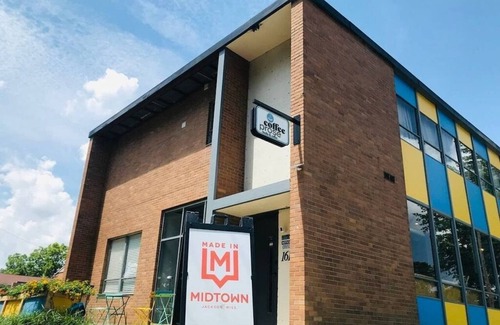 Equipped for long and short stays, this studio is an Industrial-chic urban studio apartment attached to Coffee Prose @ The Monastery in Midtown. The side door is the main door to the building. Once inside, you have a private entry door with the smart lock. We offer a queen sized bed and a leather couch. The full kitchen is equipped for you to cook. You have a Smart TV with apps. The best restaurants are close.