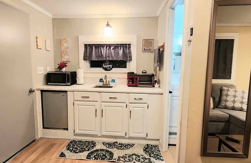 We're located in the woods nestled behind the lot surrounded by mature plants and trees. Enjoy your peaceful retreat with the comforts of home, including your own private bathroom & kitchenette. The cozy twin bed and sofa bed provide a comfortable & restful night's sleep. The convertible coffee table & expandable dining table create a flexible space for dining & working. If you want privacy and comfort rolled into one, you'll definitely love our tiny home.