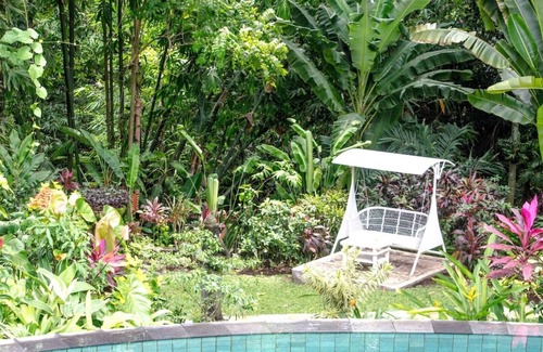 The VERANDA with dining table and day bed, overlooks secluded pool and spectacular tropical GARDENS, which extend more than 50 metres down to the river and contain a pavilion and swing. There are water features, stone carvings and shrines, and an infinity pool (10 X 4 metres) surrounded by palms, giant ferns, orchids and bougainvillea.